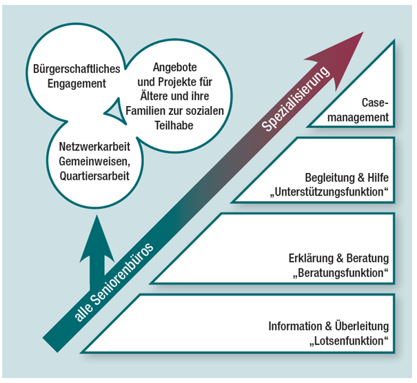 Seniorenbüros leisten gemeinwesenorientierte Seniorenarbeit in vier Handlungsfeldern: